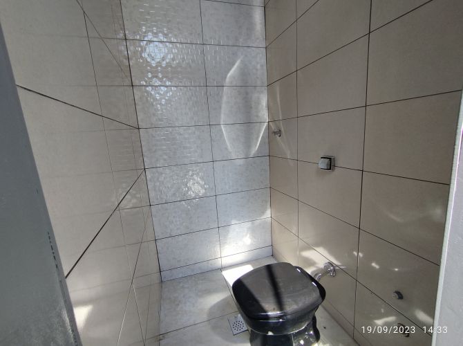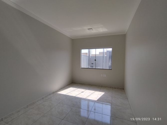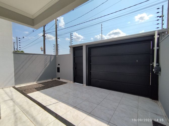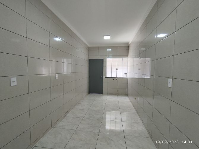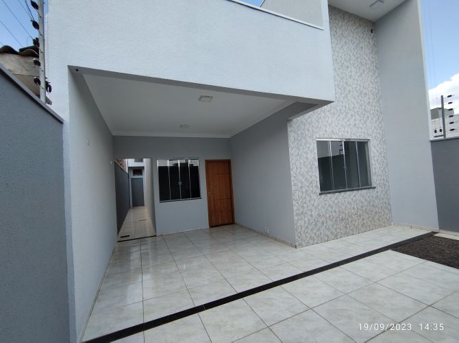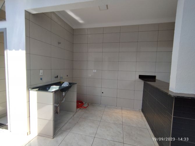 Residência contendo: dois quartos, banheiro social, sala, cozinha, área de serviço, espaço coberto com churrasqueira, banheiro de serviço e garagem.