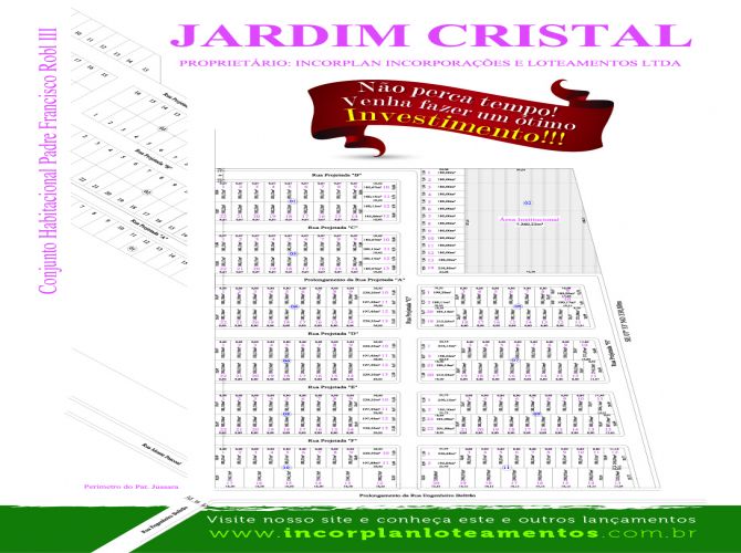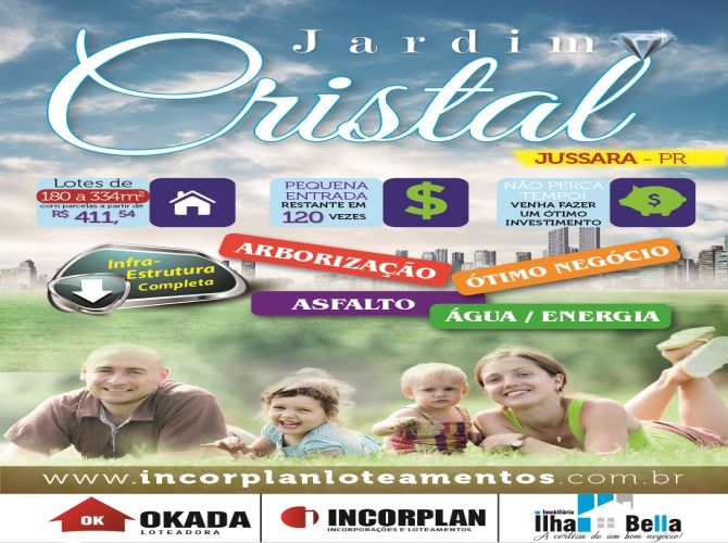 ULTIMAS UNIDADES ! No Município de Jussara está localizado o Jardim Cristal, em uma região privilegiada da cidade, contém 225 Lotes residênciais. Conta com toda a infraestrutura composta por Asfalto, Rede de Água Potável, Rede de Energia Elétrica, Arborização e Rede de Galeria de Águas Pluviais Faça já seu investimento no Jardim Cristal e conheça o nosso plantão de vendas.