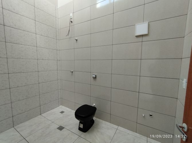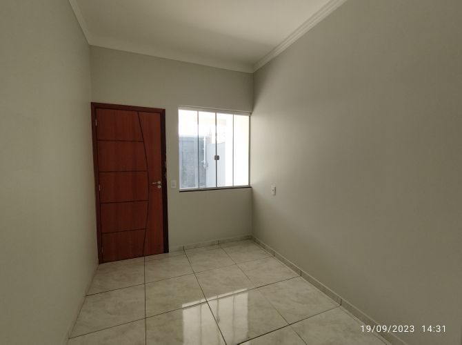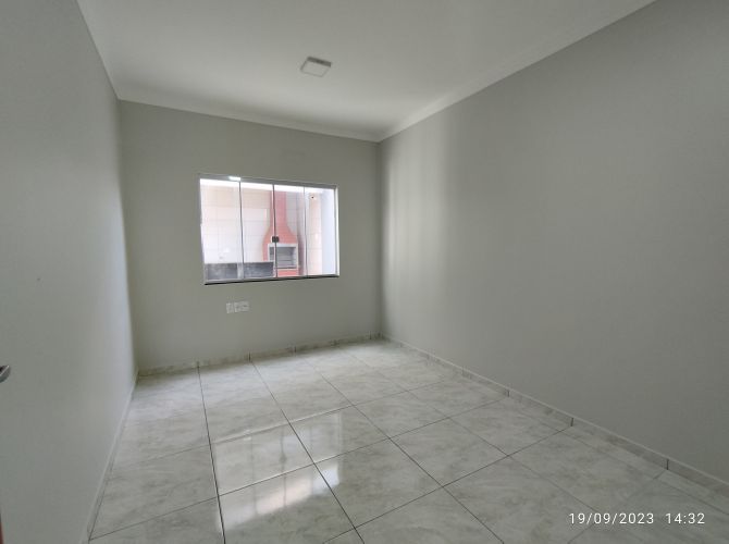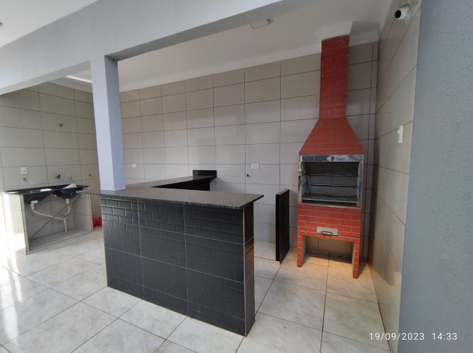 Residência contendo: dois quartos, banheiro social, sala, cozinha, área de serviço, espaço coberto com churrasqueira, banheiro de serviço e garagem.