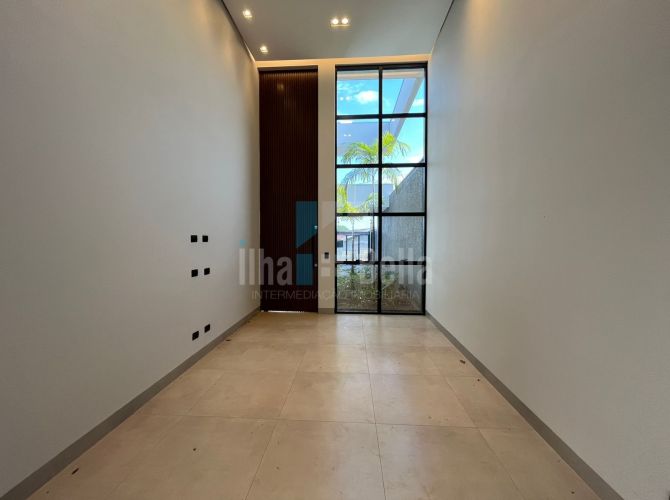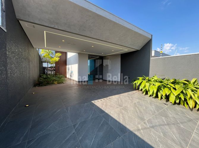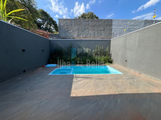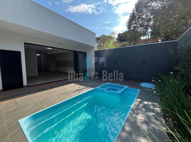 Casa de alto padrão próxima ao Banco Sicoob com 253,80m² de terreno e 153,80m² de construção, sendo: 01 suíte, 02 quartos, sala de estar, cop/cozinha gourmet integrados, jardim de inverno, lavabo, lavanderia fechada, piscina com 14,84m² e garagem ampla. Toada a casa com rebaixamento em gesso.
